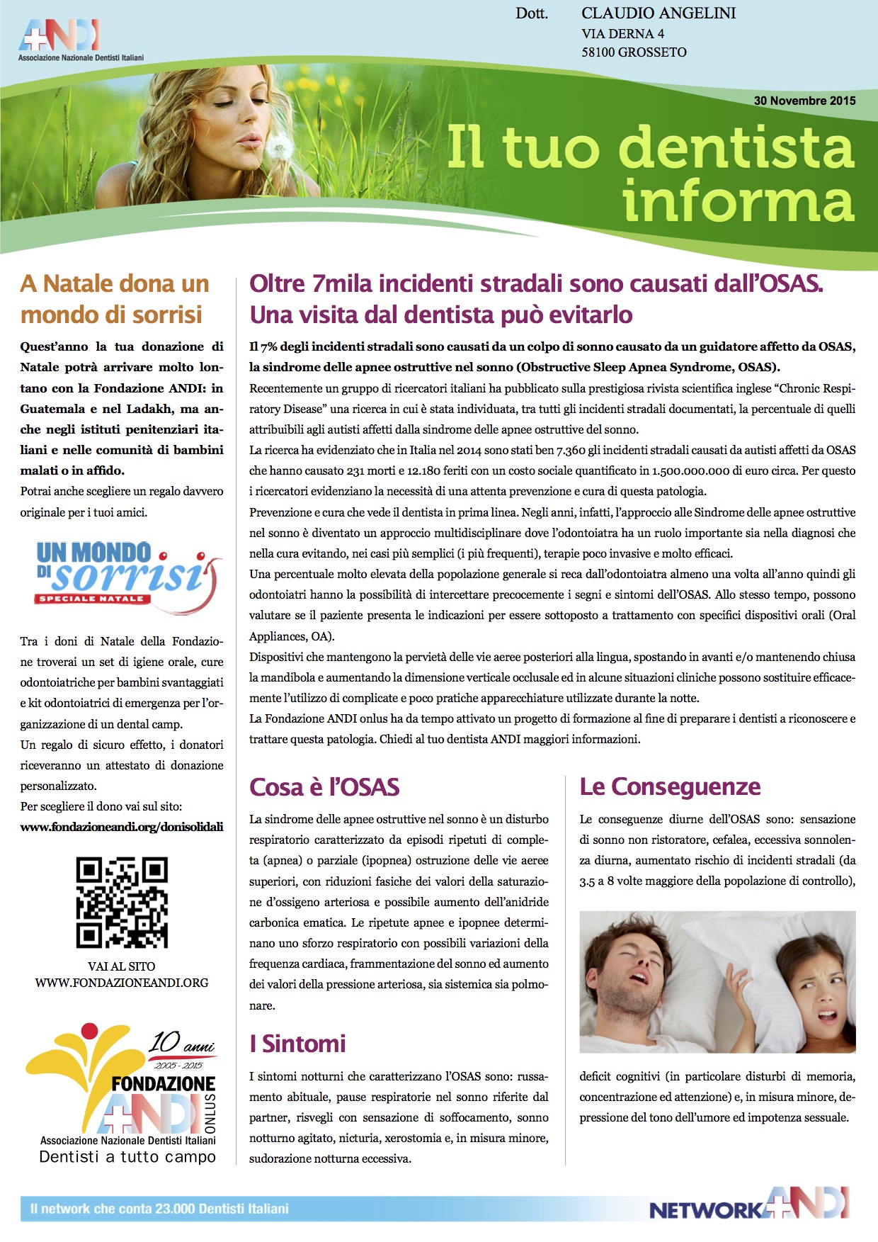 Nel numero di Novembre dell’informativa mensile di Andi (Associazione nazionale dentisti italiani) viene spiegato come questa patologia, oltre a far a correre dei rischi a chi ne soffre durante il sonno, può essere la causa di colpi di sonno diurni durante la guida di veicoli provocando incidenti anche mortali.